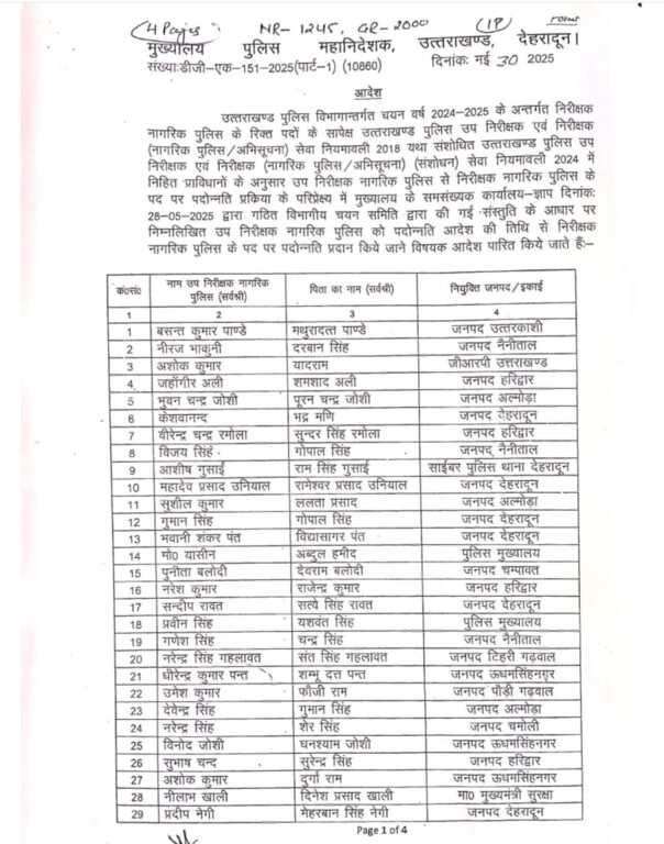 उत्तराखण्ड पुलिस विभागान्तर्गत चयन वर्ष 2024-2025 के अन्तर्गत निरीक्षक नागरिक पुलिस के रिक्त पदों के सापेक्ष उत्तराखण्ड पुलिस उप निरीक्षक एवं निरीक्षक (नागरिक पुलिस/अभिसूचना) सेवा नियमावली 2018 यथा संशोधित उत्तराखण्ड पुलिस उप निरीक्षक एवं निरीक्षक (नागरिक पुलिस/अभिसूचना) (संशोधन) सेवा नियमावली 2024 में निहित प्राविधानों के अनुसार उप निरीक्षक नागरिक पुलिस से निरीक्षक नागरिक पुलिस के पद पर पदोन्नति प्रकिया के परिप्रेक्ष्य में मुख्यालय के समसंख्यक कार्यालय-ज्ञाप दिनांकः 28-05-2025 द्वारा गठित विभागीय चयन समिति द्वारा की गई संस्तुति के आधार पर निम्नलिखित उप निरीक्षक नागरिक पुलिस को पदोन्नति आदेश की तिथि से निरीक्षक नागरिक पुलिस के पद पर पदोन्नति प्रदान किये जाने विषयक आदेश पारित किये जाते हैं