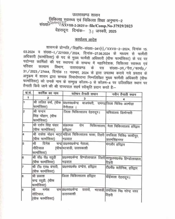 उत्तराखंड स्वास्थ्य विभाग में 75 चीफ फार्मासिस्टों का प्रदेश के विभिन्न स्वास्थ्य केन्द्रों व जिला अस्पतालों में तबादला किया गया है। अपर सचिव स्वास्थ्य अनुराधा पाल ने तबादला आदेश जारी करते हुए सभी फार्मास्टिों को तत्काल प्रभाव से नवीन तैनाती स्थल पर सेवाएं देने के निर्देश जारी किए हैं। आपको अवगत करा दें कि फार्मेसी अधिकारी (फार्मासिस्ट) के पद से मुख्य फार्मेसी अधिकारी (चीफ फार्मासिस्ट) के पद पर पदोन्न किया गया है।