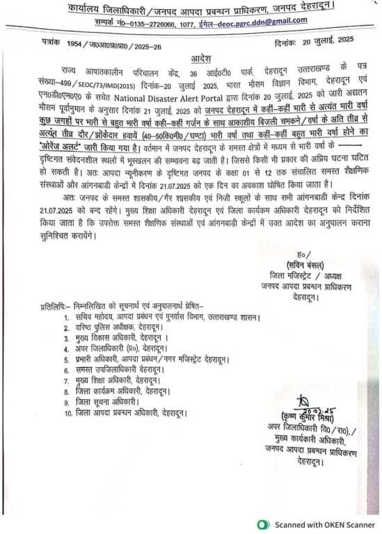 राज्य आपातकालीन परिचालन केंद्र, 36 आई०टी० पार्क, देहरादून उत्तराखण्ड के पत्र संख्या-499 / SEOC/73/IMD(2015) दिनांक-20 जुलाई 2025, भारत मौसम विज्ञान विभाग, देहरादून एवं एन०डी०एम०ए० के सचेत National Disaster Alert Portal द्वारा दिनांक 20 जुलाई, 2025 को जारी अद्यतन मौसम पूर्वानुमान के अनुसार दिनांक 21 जुलाई, 2025 को जनपद देहरादून में कहीं-कहीं भारी से अत्यंत भारी वर्षा कुछ जगहों पर भारी से बहुत भारी वर्षा कहीं-कहीं गर्जन के साथ आकाशीय बिजली चमकने / वर्षा के अति तीव्र से अत्यंत तीव्र दौर/झोंकेदार हवायें (40-50 कि0मी0 / घण्टा) भारी वर्षा तथा कहीं-कहीं बहुत भारी वर्षा होने का “ओरेंज अलर्ट” जारी किया गया है। वर्तमान में जनपद देहरादून के समस्त क्षेत्रों में मध्यम से भारी वर्षा के दृष्टिगत संवेदनशील स्थलों में भूस्खलन की सम्भावना बढ़ जाती है। जिससे किसी भी प्रकार की अप्रिय घटना घटित हो सकती है। अतः आपदा न्यूनीकरण के दृष्टिगत जनपद के कक्षा 01 से 12 तक संचालित समस्त शैक्षणिक संस्थाओं और आंगनबाडी केन्द्रों में दिनांक 21.07.2025 को एक दिन का अवकाश घोषित किया जाता है।