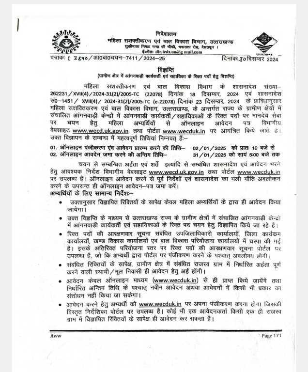 देहरादून । प्रदेश के विभिन्न जिलों के ग्रामीण क्षेत्रों में आंगनबाडी और सहायिका के पदों के लिए ऑनलाइन आवेदन 2 जनवरी से किया जा सकेगा। यह जानकारी देते हुए महिला सशक्तिकरण एवं बाल विकास मंत्री रेखा आर्या ने बताया कि इसके लिए शासनादेश पहले ही जारी कर दिया गया था।