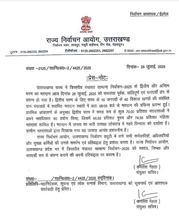 उत्तराखण्ड राज्य में त्रिस्तरीय पंचायत सामान्य निर्वाचन-2025 के द्वितीय और अन्तिम चरण का मतदान आज दिनांक 28 जुलाई, 2025 को सफलता पूर्वक, शांतिपूर्ण एवं पारदर्शी ढंग से संपन्न हो गया है। द्वितीय चरण के लिए राज्य के 10 जनपदों के 40 विकास खण्डों की संबंधित ग्राम पंचायतों में स्थापित मतदान स्थलों में प्रातः 08:00 बजे से मतदान की प्रक्रिया प्रारम्भ हुई।