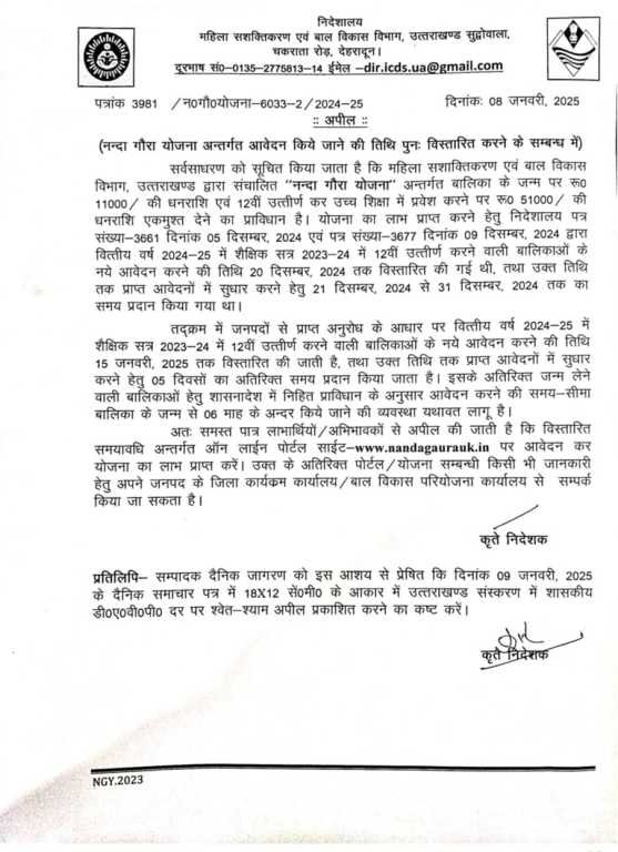 सर्वसाधरण को सूचित किया जाता है कि महिला सशाक्तिकरण एवं बाल विकास विभाग, उत्तराखण्ड द्वारा संचालित “नन्दा गौरा योजना” अन्तर्गत बालिका के जन्म पर रू० 11000 / की धनराशि एवं 12वीं उत्तीर्ण कर उच्च शिक्षा में प्रवेश करने पर रू0 51000 / की धनराशि एकमुश्त देने का प्राविधान है। योजना का लाभ प्राप्त करने हेतु निदेशालय पत्र संख्या-3661 दिनांक 05 दिसम्बर, 2024 एवं पत्र संख्या-3677 दिनांक 09 दिसम्बर, 2024 द्वारा वित्तीय वर्ष 2024-25 में शैक्षिक सत्र 2023-24 में 12वीं उत्तीर्ण करने वाली बालिकाओं के नये आवेदन करने की तिथि 20 दिसम्बर, 2024 तक विस्तारित की गई थी, तथा उक्त तिथि तक प्राप्त आवेदनों में सुधार करने हेतु 21 दिसम्बर, 2024 से 31 दिसम्बर, 2024 तक का समय प्रदान किया गया था।