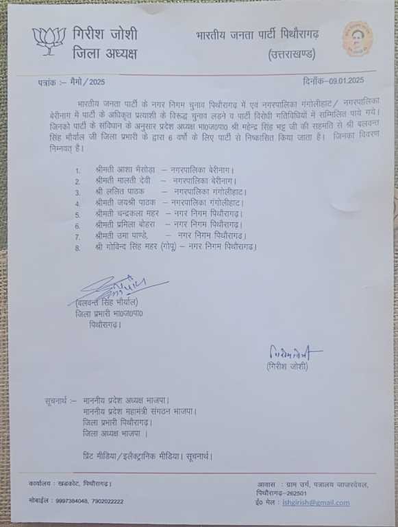 प्रदेश अध्यक्ष महेन्द्र भट्ट, जिला प्रभारी बलवंत सिंह भोर्याल, भाजपा चुनाव प्रबंधन समिति द्बारा पार्टी के प्रत्याशी के विपक्ष में चुनाव लडने पर उपरोक्त सूची में शामिल नामों का भाजपा से निलंबित किया गया है।