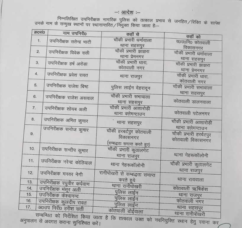 आज दिनांक 08/02/2025 को वरिष्ठ पुलिस अधीक्षक देहरादून द्वारा निम्न निरीक्षक/उप निरीक्षकों के स्थानांतरण उनके नाम के सम्मुख अंकित स्थानों पर किए गए