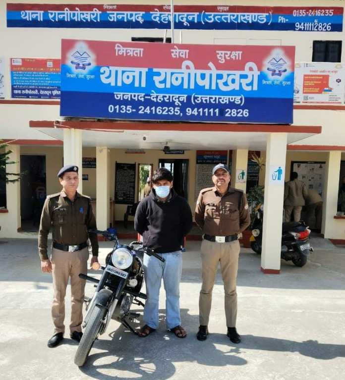 दिनांक – 02/03/2025 को थाना रानीपोखरी क्षेत्रान्तर्गत पुलिस टीम द्वारा शान्तिनगर कट के पास वाहन चैकिग की जा रही थी। इस दौराने ड्यूटी पर नियुक्त हे0का0 246 सचिन मलिक द्वारा तेजी से आ रहे एक बुलेट मो0सा0 स0: यू0के0-07-डीए-2327 सवार व्यक्ति को चैकिंग हेतु रूकने का इशारा किया गया, लेकिन बुलेट चालक द्वारा तेजी व लापरवाही से मो0सा0 चलाते हुए पुलिस कर्मी को टक्कर मारकर गम्भीर रुप से घायल कर दिया तथा मौके से फरार हो गया। घायल पुलिस कर्मी को उपचार हेतु तत्काल जॉलीग्रान्ट अस्पताल मे भर्ती कराया गया। घटना के संबंध के अभियुक्त के विरूद्ध थाना रानीपोखरी पर मु0अ0सँ0- 20/25 धारा 281/125/121(2) भा०न्या०सं० पंजीकृत किया गया था।
