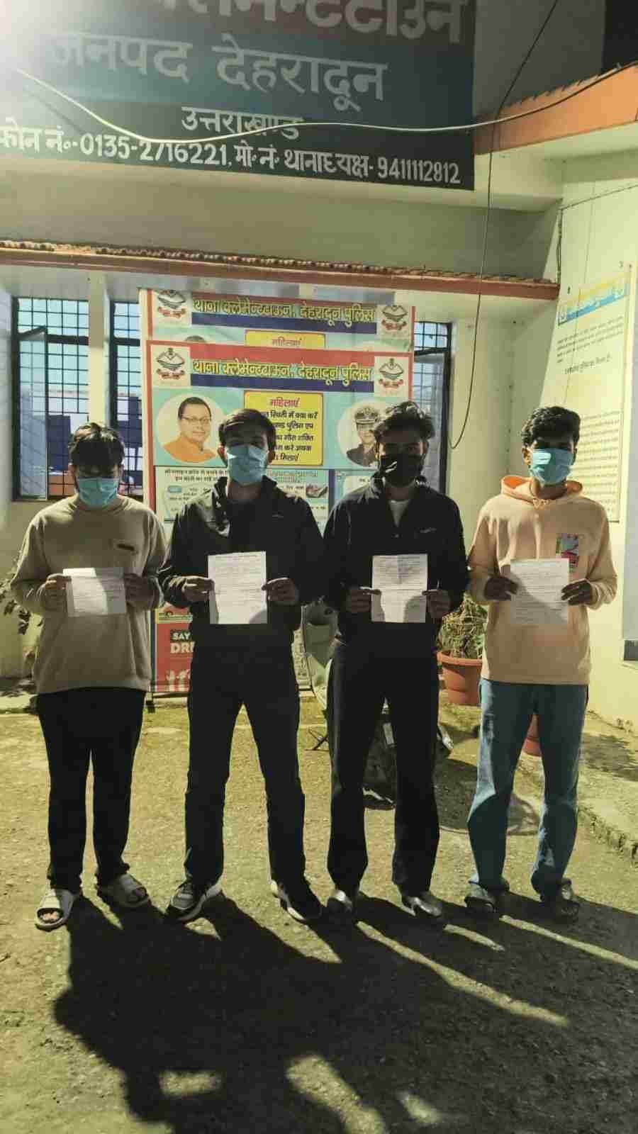 सोशल मीडिया पर वायरल एक वीडियो, जिसमें कुछ युवक क्लेमेंटटाउन क्षेत्र में सार्वजनिक स्थान पर लड़ाई झगड़ा करते हुए दिखाई दे रहे थे, उक्त वायरल वीडियो का संज्ञान लेते हुए एसएसपी देहरादून द्वारा तत्काल उक्त युवकों की तलाश कर उनके विरुद्ध आवश्यक वैधानिक कार्यवाही के निर्देश दिए गए, जिस पर थानाध्यक्ष क्लेमटाउन के नेतृत्व में टीम गठित कर त्वरित कार्रवाई करते हुए वीडियो में दिख रहे युवकों के संबंध में जानकारी एकत्र करते हुए 04 युवकों (1)-यश्वसी गौतम पुत्र श्री विनय कुमार गौतम, निवासी 150/2 कोतवाली चौराह हाथरस जिला अलीगड़ उत्तर प्रदेश (2)-वंश तोमर पुत्र वरुण तोमर निवासी तिशोतरा, जिला बिजनोर उतर प्रदेश (3)-ध्रुव शर्मा पुत्र रवि शंकर शर्मा, निवासी 1043 इन्द्रानगर कालोनी , बसंत बिहार देहरादून (4)- कृष्णा राठी पुत्र कर्मवीर राठी निवासी कृष्णा मार्केट, क्लेमेंट टाउन देहरादून को हिरासत में लिया गया, जिनके विरुद्ध आवश्यक वैधानिक कार्यवाही की गई।
