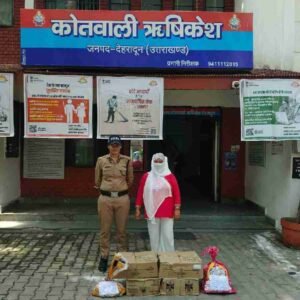 (2)- सीमा पत्नी वीरेंद्र, निवासी गली नंबर-1, चंदेश्वरवर नगर ऋषिकेश को 08 पेटी मैकडॉवल व्हिस्की, 01 पेटी सोलमेट देशी शराब व 53 बियर के साथ चंद्रेश्वर नगर ऋषिकेश से गिरफ्तार किया गया है।