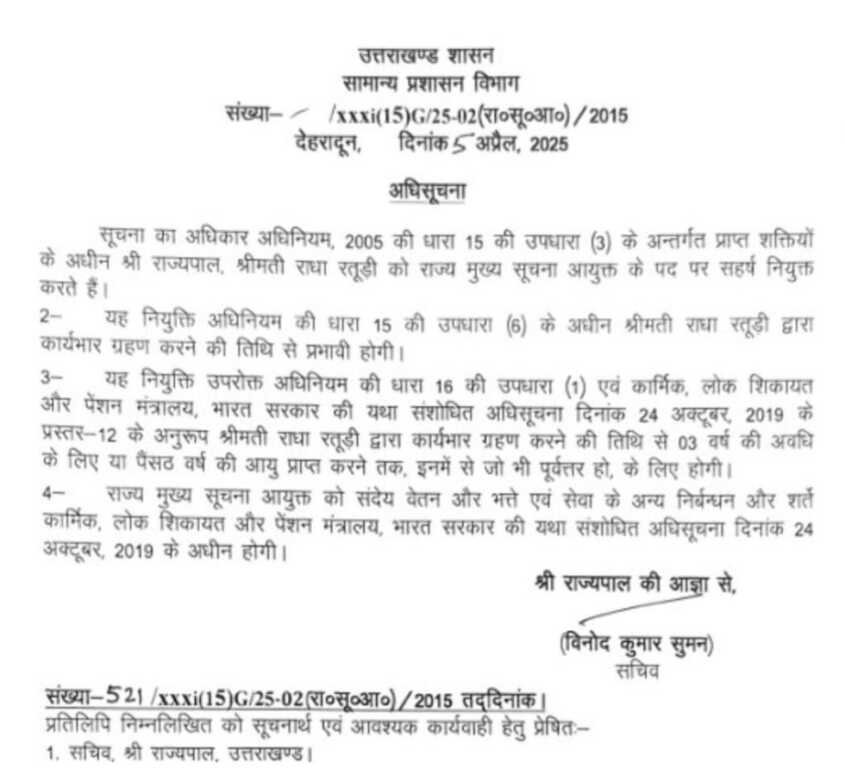 देहरादून। पूर्व मुख्य सचिव राधा रतूड़ी प्रदेश की नयी मुख्य सूचना आयुक्त होंगी। 31 मार्च को मुख्य सचिव की कुर्सी से विदाई लेने के बाद उन्हें धामी सरकार ने नयी जिम्मेदारी दी है।