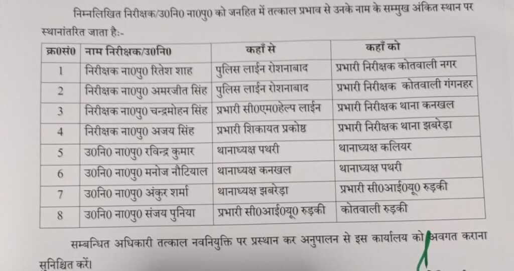 कुल 8 निरीक्षक और उप निरीक्षक के तबादले किए गए हैं। मनोज नौटियाल को पथरी थाना की जिम्मेदारी दी गई