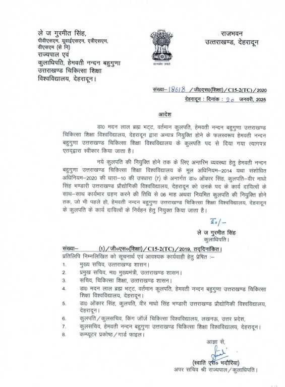 डा० मदन लाल ब्रह्म भट्ट, वर्तमान कुलपति, हेमवती नन्दन बहुगुणा उत्तराखण्ड चिकित्सा शिक्षा विश्वविद्यालय, देहरादून द्वारा अन्यत्र नियुक्ति होने के फलस्वरूप हेमवती नन्दन बहुगुणा उत्तराखण्ड चिकित्सा शिक्षा विश्वविद्यालय के कुलपति पद से दिया गया त्यागपत्र एतद्वारा स्वीकार किया जाता है।