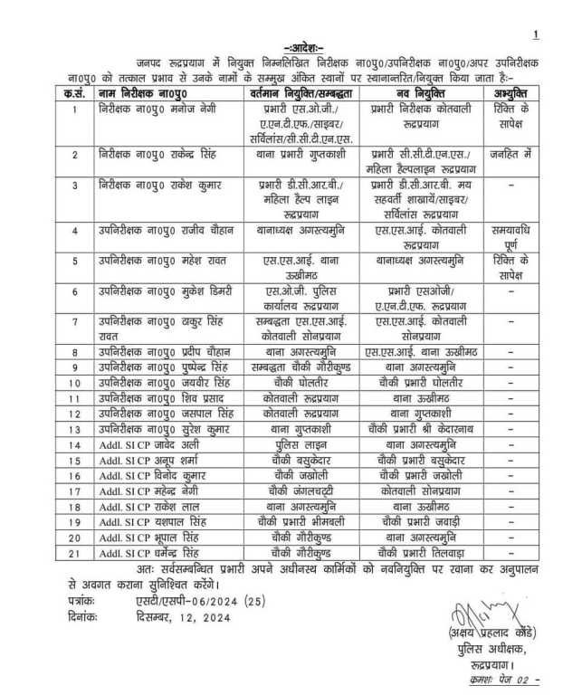 जनपद रूद्रप्रयाग में नियुक्त निम्नलिखित निरीक्षक ना०पु०/ उपनिरीक्षक ना०पु०/अपर उपनिरीक्षक ना०पु० को तत्काल प्रभाव से उनके नामों के सम्मुख अंकित स्थानों पर स्थानान्तरित/नियुक्त किया जाता हैः-