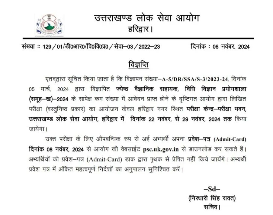 एतद्वारा सूचित किया जाता है कि विज्ञापन संख्या-A- 5/DR/SSA/S-3/2023-24, दिनांक 05 मार्च, 2024 द्वारा विज्ञापित ज्येष्ठ वैज्ञानिक सहायक, विधि विज्ञान प्रयोगशाला (समूह-ख)-2024 के सापेक्ष कम संख्या में आवेदन प्राप्त होने के दृष्टिगत आयोग द्वारा लिखित परीक्षा (वस्तुनिष्ठ प्रकार) का आयोजन केवल हरिद्वार नगर स्थित परीक्षा केन्द्र परीक्षा भवन, उत्तराखण्ड लोक सेवा आयोग, हरिद्वार में दिनांक 22 नवंबर, से 29 नवंबर, 2024 तक किया जायेगा।