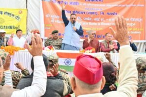 उन्होंने कहा कि विशिष्ट सेवा पदक पुरस्कार से अलंकृत सैनिकों की एकमुश्त राशि बढ़ाई गई है। द्वितीय विश्व युद्ध के पूर्व सैनिक एवं युद्ध विधवाओं को प्रतिमाह दिए जाने वाले अनुदान को 08 हजार से बढ़ाकर 10 हजार किया गया है। उन्होंने कहा कि राज्य सरकार द्वारा युद्ध में वीरगति को प्राप्त होने वाले सेना एवं अर्द्धसैन्य बलों के जवानों के एक आश्रित को उनकी शैक्षिक योग्यता के अनुसार राज्याधीन सेवाओं में नौकरी दी जा रही है। अभी तक 27 सैनिक आश्रितों को राज्याधीन सेवाओं में नौकरी दी गई है। उन्होंने कहा कि सैनिकों के सम्मान में प्रदेशभर में सैनिकों द्वार शहिद के नाम पर विद्यालयों ओर सड़क मार्ग का नाम शहीदों के नाम पर रखने का कार्य किया जा रहा है। उन्होंने कहा सैनिकों के सम्मान में बन रहे भव्य सैन्य धाम भी शीघ्र ही प्रदेश की जनता को समर्पित किया जाएगा।