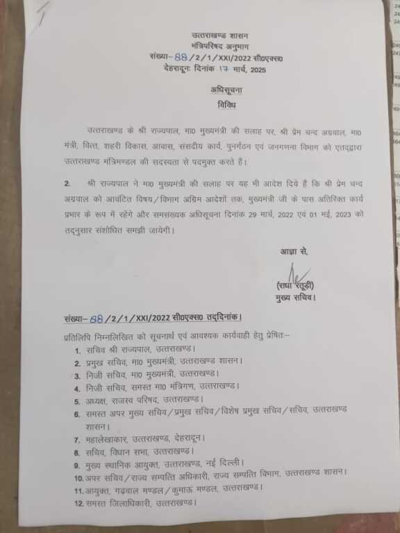 उत्तराखण्ड के श्री राज्यपाल, मा० मुख्यमंत्री की सलाह पर, श्री प्रेम चन्द अग्रवाल, मा० मंत्री, वित्त, शहरी विकास, आवास, संसदीय कार्य, पुनर्गठन एवं जनगणना विभाग को एतदद्वारा उत्तराखण्ड मंत्रिमण्डल की सदस्यता से पदमुक्त करते हैं।
