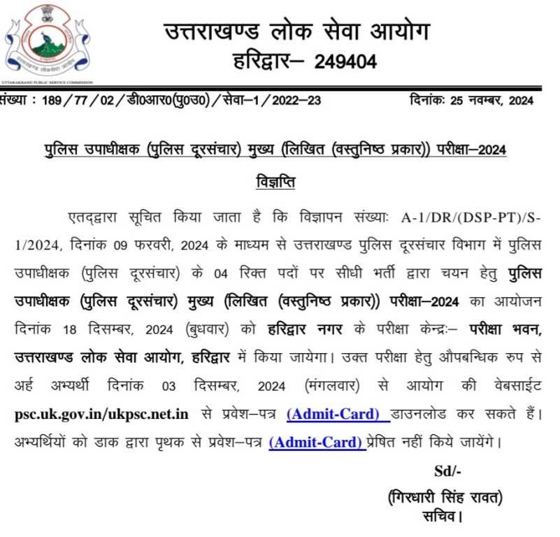 एतद्वारा सूचित किया जाता है कि विज्ञापन संख्याः A-1/DR/(DSP-PT)/S- 1/2024, दिनांक 09 फरवरी, 2024 के माध्यम से उत्तराखण्ड पुलिस दूरसंचार विभाग में पुलिस उपाधीक्षक (पुलिस दूरसंचार) के 04 रिक्त पदों पर सीधी भर्ती द्वारा चयन हेतु पुलिस उपाधीक्षक (पुलिस दूरसंचार) मुख्य (लिखित (वस्तुनिष्ठ प्रकार)) परीक्षा-2024 का आयोजन दिनांक 18 दिसम्बर, 2024 (बुधवार) को हरिद्वार नगर के परीक्षा केन्द्रः परीक्षा भवन, उत्तराखण्ड लोक सेवा आयोग, हरिद्वार में किया जायेगा। उक्त परीक्षा हेतु औपबन्धिक रुप से अर्ह अभ्यर्थी दिनांक 03 दिसम्बर, 2024 (मंगलवार) से आयोग की वेबसाईट psc.uk.gov.in/ukpsc.net.in से प्रवेश पत्र (Admit-Card) डाउनलोड कर सकते हैं। अभ्यर्थियों को डाक द्वारा पृथक से प्रवेश-पत्र (Admit-Card) प्रेषित नहीं किये जायेंगे