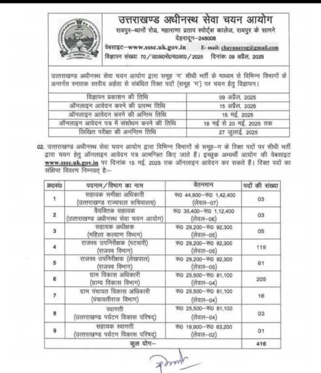 उत्तराखंड अधीनस्थ सेवा चयन आयोग ने राज्य में पटवारी, लेखपाल समेत समूह-ग के 416 पदों पर भर्ती का विज्ञापन जारी किया है। इन पदों के लिए ऑनलाइन आवेदन प्रक्रिया 15 अप्रैल से 15 मई के बीच होगी। परीक्षा की प्रस्तावित तिथि 27 जुलाई तय की गई है।