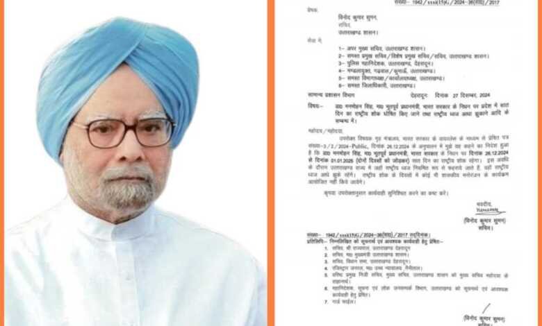 उपरोक्त विषयक गृह मंत्रालय, भारत सरकार के वायरलेस के माध्यम से प्रेषित पत्र संख्या-3/2/2024-Public, दिनांक 26.12.2024 के अनुपालन में मुझे यह कहने का निदेश हुआ है कि डा० मनमोहन सिंह, मा० भूतपूर्व प्रधानमंत्री, भारत सरकार के निधन पर दिनांक 26.12.2024 से दिनांक 01.01.2025 (दोनों दिवसों को जोड़कर) सात दिन का राष्ट्रीय शोक रहेगा। इस अवधि के दौरान उत्तराखण्ड राज्य में जहाँ राष्ट्रीय ध्वज नियमित रूप से फहराये जाते हैं, वहाँ राष्ट्रीय ध्वज आधे झुके रहेंगें। राष्ट्रीय शोक के दिवसों में कोई भी शासकीय मनोरंजन के कार्यकम आयोजित नहीं किये जायेंगे।