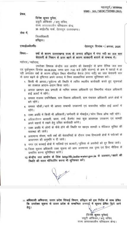 उपरोक्त विषयक केन्द्रीय जल आयोग की वेबसाईट से प्राप्त दैनिक जल स्तर एवं पूर्वानुमान दिनांक 06.08.2024, समय प्रातः 7:00 बजे (प्रति संलग्न) के क्रम में पहाड़ों में हो रही लगातार वर्षा के कारण हरिद्वार स्थित भीमगौडा बैराज (गंगा नदी) का जल चेतावनी स्तर से ऊपर बढ़ने के दृष्टिगत अपने जनपद में निम्न सावधानियां बरतना सुनिश्चत करें-