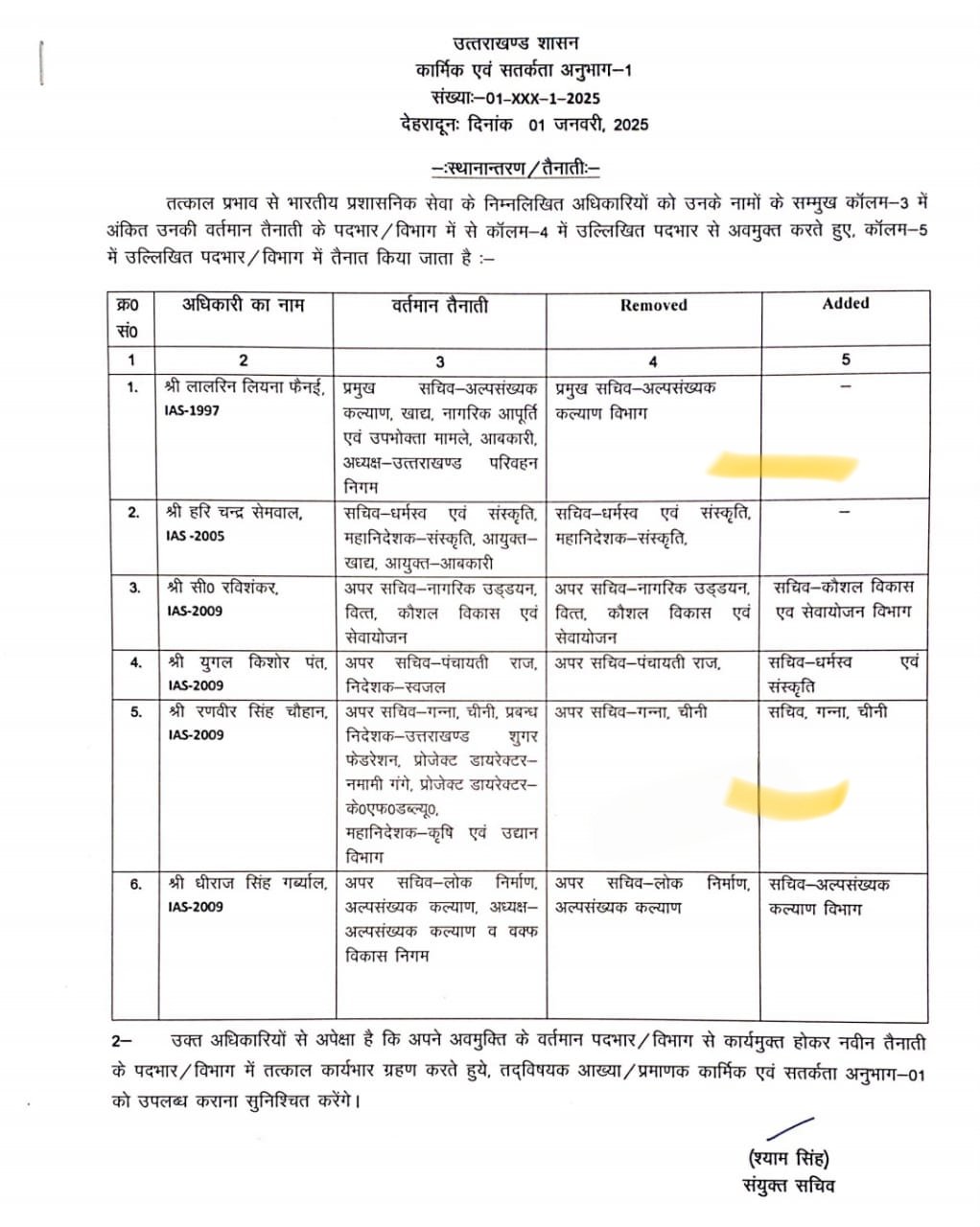 आइएएस लालरिन लियना फैनई से प्रमुख सचिव अल्पसंख्यक विभाग का दायित्व हटा लिया गया है। हरि चंद्र सेमवाल से सचिव धर्मस्व एवं संस्कृति व महानिदेश संस्कृति का दायित्व हटा लिया गया है। सी रविशंकर के पास से अपर सचिव नागरिक उड्डयन, वित्त, कौशल विकास एवं सेवायोजन विभाग हटाकर सचिव कौशल विकास एवं सोवायोजन विभाग का दायित्व दिया गया है।