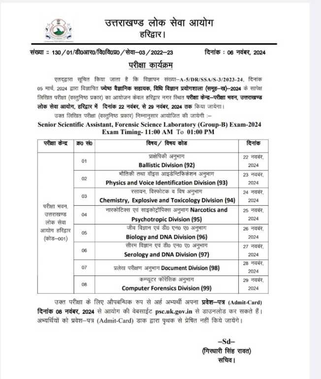 उत्तराखंड लोक सेवा आयोग ने समूह ख के विज्ञापन संख्या-A-5/DR/SSA/S-3/2023-24, दिनांक 05 मार्च, 2024 द्वारा विज्ञापित ज्येष्ठ वैज्ञानिक सहायक, विधि विज्ञान प्रयोगशाला (समूह-ख)-2024 के सापेक्ष लिखित परीक्षा (वस्तुनिष्ठ प्रकार) का आयोजन केवल हरिद्वार नगर स्थित परीक्षा केन्द्र परीक्षा भवन, उत्तराखण्ड लोक सेवा आयोग, हरिद्वार में दिनांक 22 नवंबर, से 29 नवंबर, 2024 तक किया जायेगा।