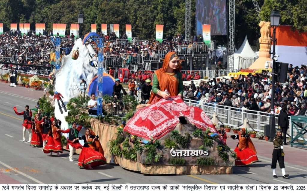 महानिदेशक सूचना श्री बंशीधर तिवारी ने कहा कि कर्तव्य पथ पर गणतंत्र दिवस परेड में उत्तराखंड की झांकी में राज्य से 16 कलाकारों ने भाग लिया। झांकी में उत्तराखण्ड की सामाजिक, सांस्कृतिक और धार्मिक महत्व को दर्शाती प्रसिद्ध ऐपण कला, उत्तराखण्ड के साहसिक खेलों एवं साहसिक पर्यटन को चित्रित किया गया। उन्होंने कहा कि मुख्यमंत्री के निर्देशानुसार राज्य सरकार द्वारा सांस्कृतिक विरासत को बढ़ावा देने और साहसिक खेलों को राष्ट्रीय स्तर पर पहचान दिलाने के लिए गणतंत्र दिवस की परेड में झांकी के रूप में प्रदर्शित करने का निर्णय लिया गया।