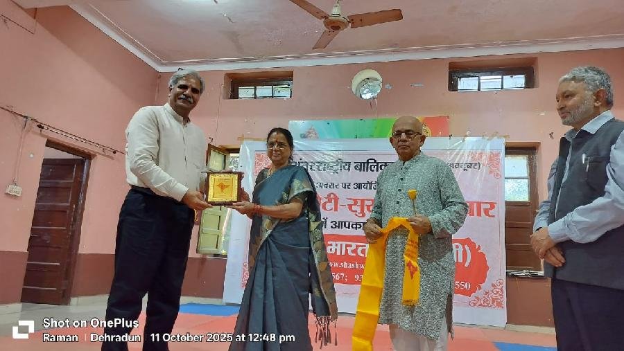 शाश्वत भारत ट्रस्ट द्वारा कन्या गुरुकुल महाविद्यालय, देहरादून के सहयोग से अंतरराष्ट्रीय बालिका दिवस (11अक्टूबर)के अवसर पर *सतर्क बेटी- सुरक्षित परिवार* विषय पर एक इंटरएक्टिव विचार गोष्ठी का आयोजन किया गया। कार्यक्रम का शुभारंभ दीप प्रज्ज्वलित कर किया गया। कार्यक्रम में कन्या गुरुकुल महाविद्यालय,राजकीय कन्या इंटर कॉलेज, हिम ज्योति स्कूल , दिल्ली पब्लिक स्कूल, तथा कन्या गुरुकुल विद्यालय की लगभग 300 छात्राओं और इन विद्यालयों की अध्यापिकाओं ने भी प्रतिभाग किया। कार्यक्रम में मुख्य अतिथि के रूप में श्रीमती कुसुम कंडवाल, उत्तराखंड राज्य महिला आयोग की अध्यक्ष, कन्या गुरुकुल महाविद्यालय की प्राचार्य डॉक्टर हेमन पाठक, दिल्ली पब्लिक स्कूल, देहरादून के प्रधानाचार्य डॉ बी के सिंह, कन्या गुरुकुल की प्रधानाचार्य संतोष कुमारी के अलावा विश्व विख्यात न्यूरोसर्जन डॉक्टर एके सिंह, कार्डियोलॉजिस्ट डॉक्टर कुलदीप दत्त जो ट्रस्ट के अध्यक्ष भी है ,संस्था के सचिव डॉक्टर माधव प्रसाद मैथानी ,संस्था के अन्य ट्रस्टी गण श्री राकेश अग्रवाल, श्रीमती ज्योति धवन, रंजन कोटनाला आदि ने प्रतिभाग किया ।